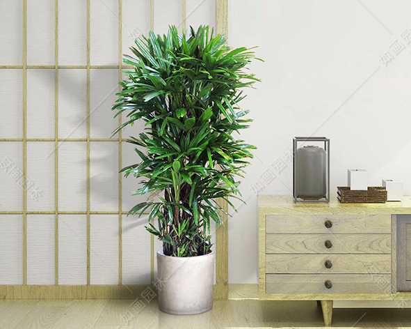 产品简介:棕竹耐阴、耐湿、喜散射光,可长期在室内光线明亮的地方摆放,并能保持其浓绿的叶色。棕竹丛生挺拔,枝叶繁茂,姿态潇洒,叶形秀丽,四季青翠,似竹非竹,美观清雅,富有热带风光,可摆放在会议室、宾馆门口两侧,颇为雅观。如果家里客厅摆放高低错落有致、疏密协调的浅盆棕竹盆景,旁边再配几块山石,更显得玲珑秀丽。